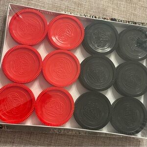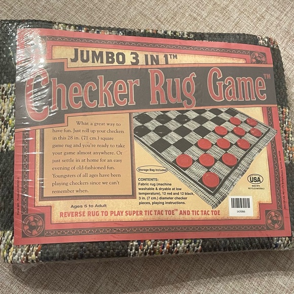 Jumbo 3-in-1 rug game where you can play checkers, or reverse it to play “super tic tac toe,” or traditional tic tac toe.