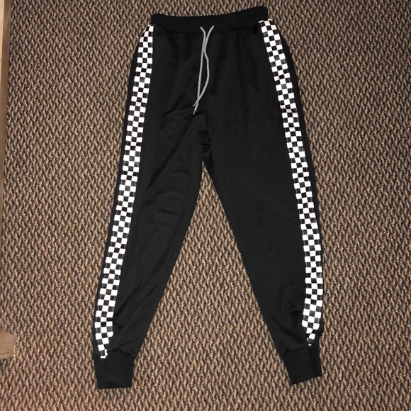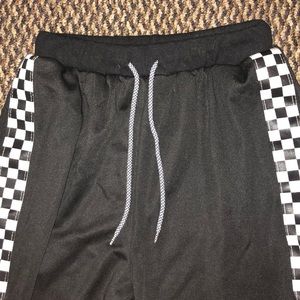 Silky fabric sweatpants with checkered stripes on the side. Elastic waistband and around ankles