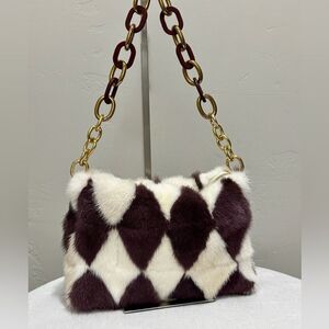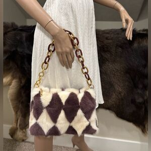 Only one available. Handmade from dyed genuine mink fur, chic colorblock and checkerboard patchwork pattern, includes 2 chain styles, can match different outfits. Use in multiple ways, hand carry, underarm, shoulder bag or as a crossbody. Inside spacious enough for your phone, cosmetics, sunglasses, compact umbrella, keys and other items. This fur purse is perfect for casual wear, evening out or a gift for an important someone.