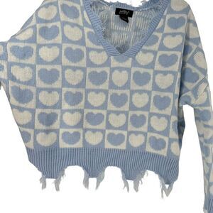 Checkerboard Sweater Blue & White Heart Pattern Oversized Frayed Fringe Trim V Neck Crop Just Polly New York Brand