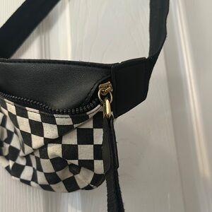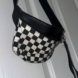 Stylish checkered crossbody bag in black and white. Perfect for casual outings.