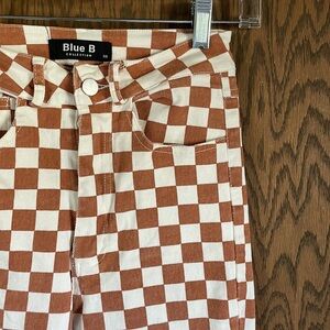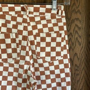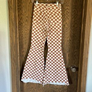 Stylish checkered flare pants with a bold design. Perfect for a trendy look. Orangey brown