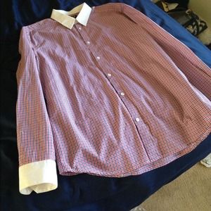 Navy white and red plaid/checkered shirt. White collar and cuffs.
