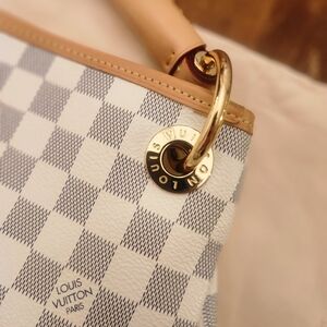 LV style handbag. Top quality. Sueded inside, real leather braided handle. Many inside pockets. Keychain/lanyard. Barely used- just purchased at Christmas. I love it, but it's just too big. One very small mark on bottom (refer to photo). Dust bag has a mark on it and a small hole (refer to photo). Please ask questions.