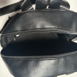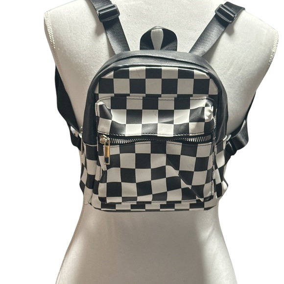 Stylish checkered mini backpack with adjustable straps. Features a front zip pocket.
