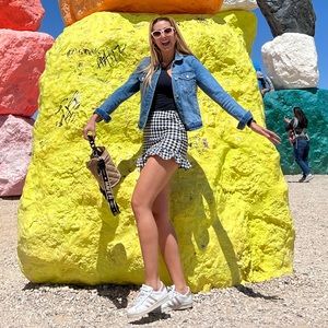 This black and white checkered mini skirt was used once at a Las Vegas trip. This is size small and fitted to the curves.