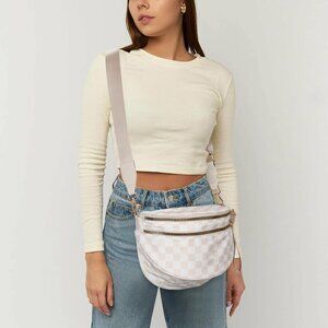 Features: Spacious checkered nylon fanny pack with a sleek, waterproof feel. Fits a Stanley Cup up to 40oz and daily essentials easily. Adjustable shoulder strap up to 52 inches for a perfect fit, whether you're tall or petite. Features two roomy zippered compartments with bold zipper pulls—great for organizing your stuff.