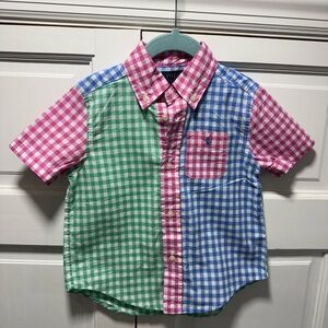 Vibrant checkered shirt with pink, green, and blue patterns. Short sleeves and button-down style. Perfect for playful days.