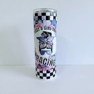 Stylish tumbler featuring a checkered pattern and floral accents. Perfect for racing enthusiasts.