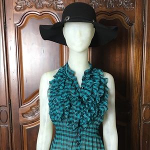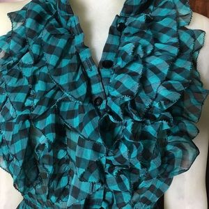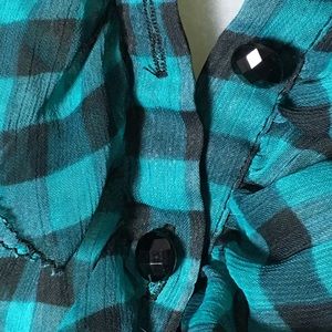 Flattering top due to ruffled bottom. It measures 26in length & 13in for width. Pit to pit is 16.5, armhole 9in & 19in peplum. The collar is 1in tall and 6.5in wide. Material is lightweight and sheer. Fastens with 10 small blk glass buttons. The blouse goes great with jeans or slacks.