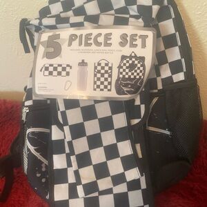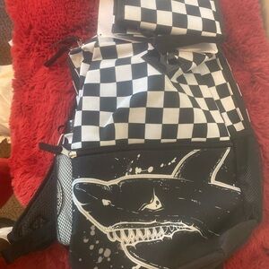 Stylish backpack with a bold shark design and checkered pattern. Perfect for school or travel.