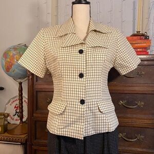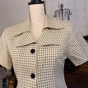 Stylish checkered blouse with short sleeves. Features a classic collar and button-up front.
