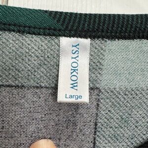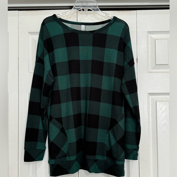 Green & black checkered top has pockets on each side. It’s very soft.