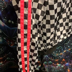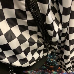 Stylish women's jacket featuring a bold checkered pattern with vibrant pink stripes. Perfect for adding a pop of color to your wardrobe.