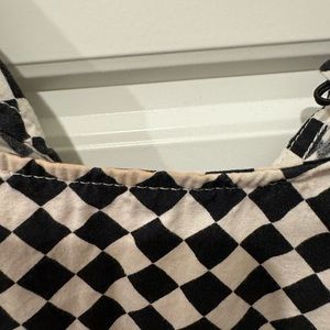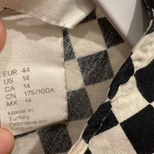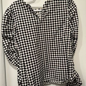 Checkered blouse. Scrunched long sleeves. Well fitted. Slight makeup stain on the neckline, as pictured.
