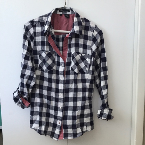 Navy blue and white checkered button down with red lining details! It’s never been worn with the tags attached. Extra buttons provided!