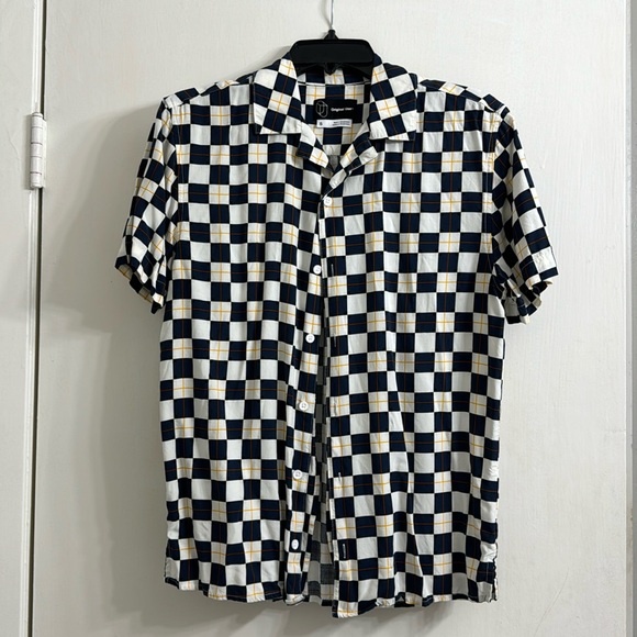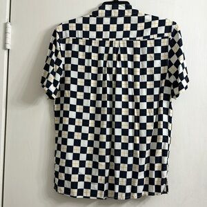 Original Use Target button up shirt with gold/navy checkerboard pattern. 100% rayon.