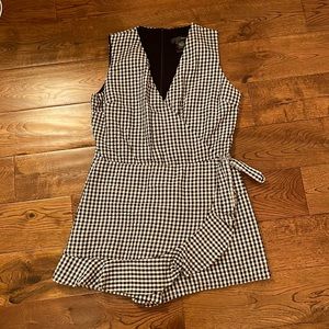 Black and white checkered, romper, wrap looking in the front, zipper in the back