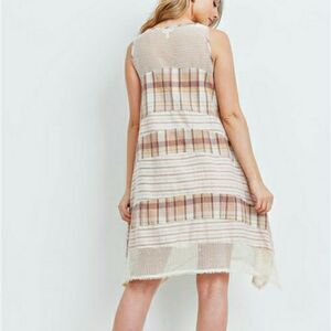 This boho dress is all you've been waiting for ! Made of 100% Cotton. Multi toned checkered patterns of cream and browns with mesh details. Sleeveless, lightweight swing or shift style with a unique hem . Identical to the anthropology holding horses dress ! Can be paired with heels, sandals or sneakers. Lined.