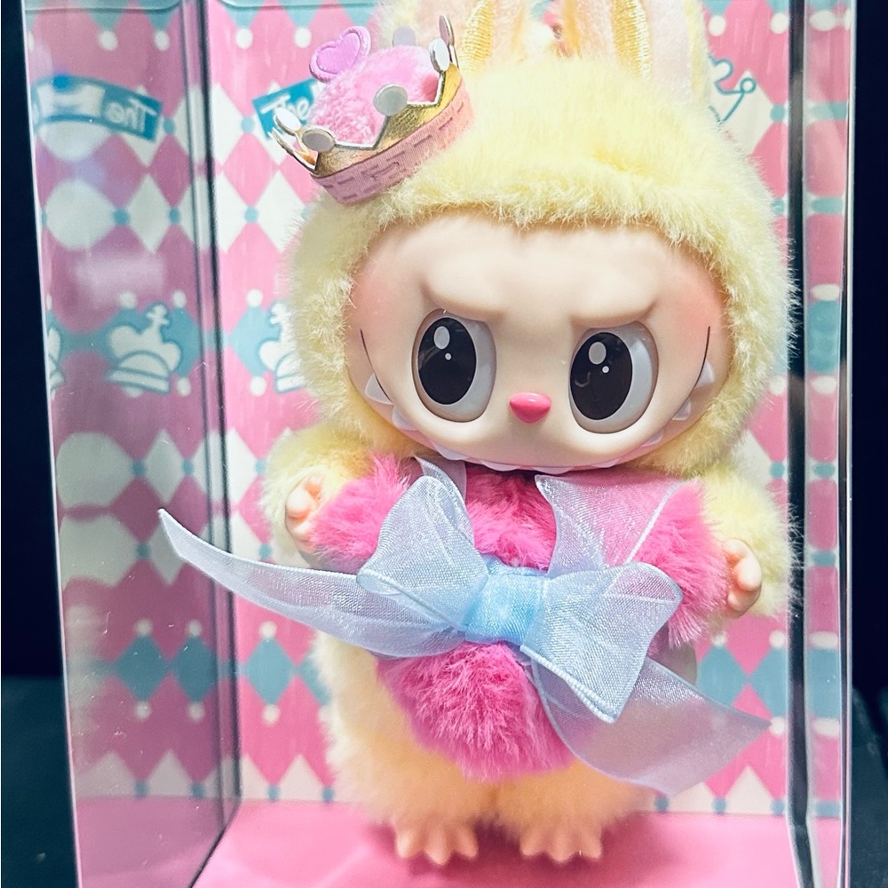 Delight your child with this charming doll featuring a pink and yellow design. Adorned with a cute crown, it's perfect for imaginative play. Authentic Checkmate Labubu.