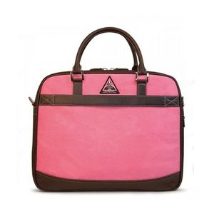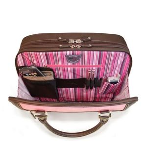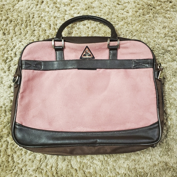 Great Condition. TSA Compliant. Fits A Laptops Up To 16". Rich Pink Suede and Brown Faux-Leather Exterior. Separate Zippered Workstation and File Sections. Easy-Access Exterior Pockets. Durable Steel Fittings & Faux Leather Wrapped Handles.