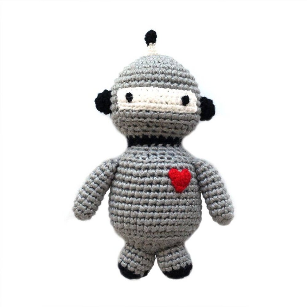 This adorable robot rattle is lovingly hand-crocheted using luxuriously soft yarn derived from the pulp of the organically grown and sustainably harvested bamboo trees.