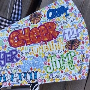This bright and colorful megaphone is for the cheerleader in your life! It can be used as an ornament, decorative wall hanging, shelf decor, etc. It is 5.5” x 2.5”