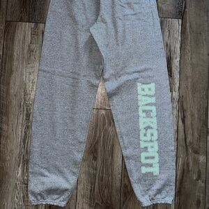 Great Drawsting Sweatpants, has the word BACKSPOT on the leg. Charcoal Grey with Mint wording on the leg.