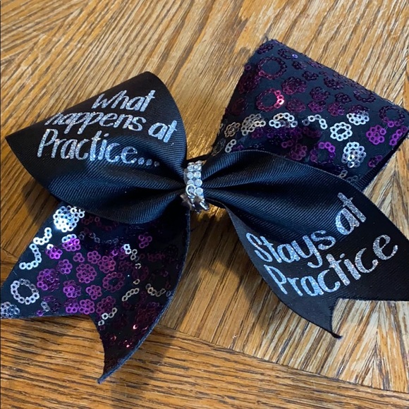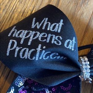 “What happens at practice stays at practice” bow with a cute shiny pattern and a bow charm in the middle.