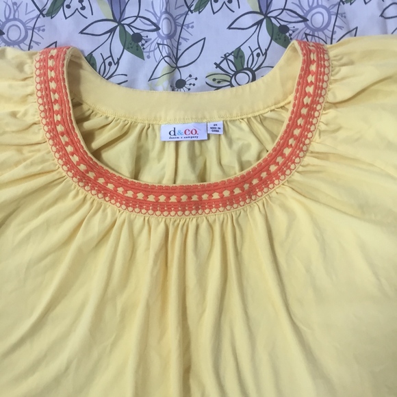 Denim & Company short sleeve top in sunny yellow with delicate orange embroidery. Scoop neck with pleated detailing. 26" across at the bust. Very high quality cotton fabric in EUC!