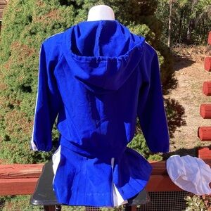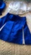 There is a three piece outfit made of a blue polyester uniform material