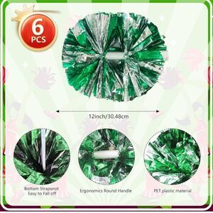 Set of six green and silver cheerleading pom poms with baton handles and bags. Features finger-friendly rings for cheerleading squads. Metallic dance team spirited sports accessories. Set of six for three people.