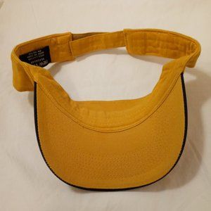 Yellow and black cheerleading visor. Has white lettering. Has velcro closure. Has been used/worn. Look at all pictures closely.