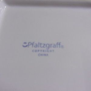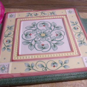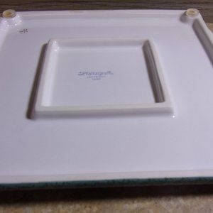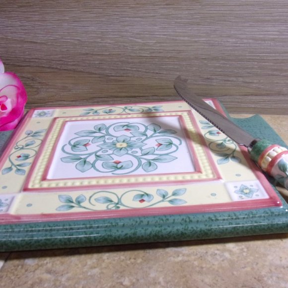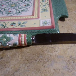 Kat is pleased to present a Pfaltzgraff cheese board in the Orleans floral green & vine pattern. It measures 7 1/2" by 9 1/2" and the knife is 8" long with a matching ceramic handle.