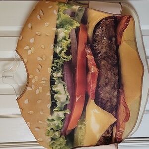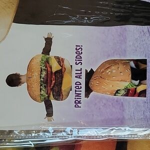 Fun burger print costume. Features realistic burger design with lettuce, pickle, bacon,onion, tomato, and cheese. Printed on both sides! This is a fun and hilarious costume! One size fits most up to size 14 kids. Very gently worn and in great condition!