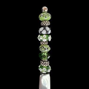 Beautiful handcrafted cheese knife with large green black white and silver beads. 7 inches in length. Hand wash only do not put in dishwasher.