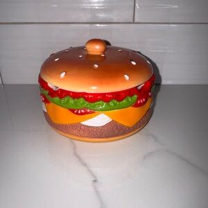 Includes plastic cheeseburger server with four compartments, lid, and four small spoons.