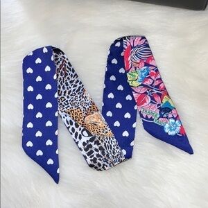 Brand new! Beautiful cheetah animal print with tropical bird that says “Paris France” on one side and the other side is blue with whote hearts.  scarf is 33”x2”.  Bag is NOT included.