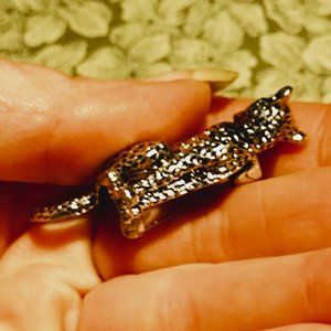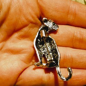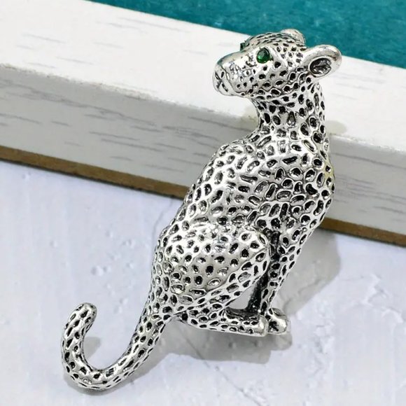 This small silver cheetah has faux emerald eyes.