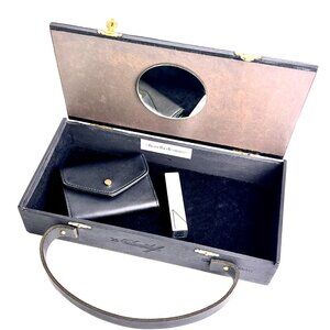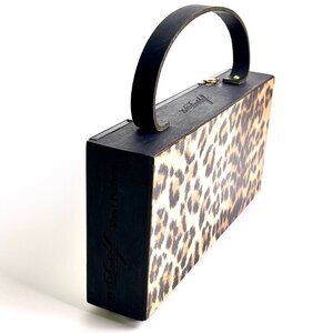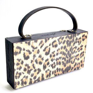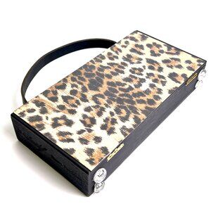 This wildly fun purse is made from a unique, long wood cigar box. A neutral cheetah print covers both sides of the black box. The finishing touches are the black leather handle, interior velvet lining and mirror. Simple, but eye-catching, this handbag pairs well with many outfits! Includes a fabric drawstring bag for storage.
