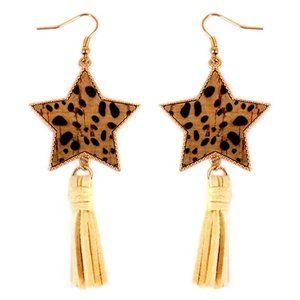 Chic animal print pairs with a trendy tassel in these super cute earrings! - Star shaped cheetah print cork with worn goldtone trim - Faux Leather Tassels - Worn Goldtone finish - 3.75" Fish Hook Style Earrings with 3.25" Drop - Lead & Nickel Compliant New in Package Comes from a smoke free home Bundle & Save
