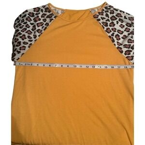 Solid color mustard yellow top with cheetah accents and fringe hem