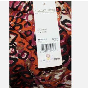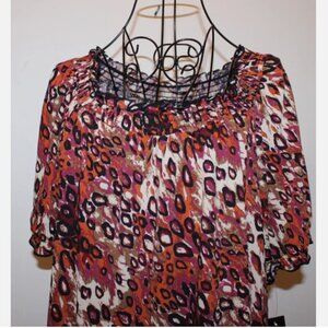 Tan, brown, and black short sleeve pullover top with an elasticized neckline, can be worn off the shoulder. Fabric is polyester. Size extra large, bust is 48", This is new with tag from Notations.