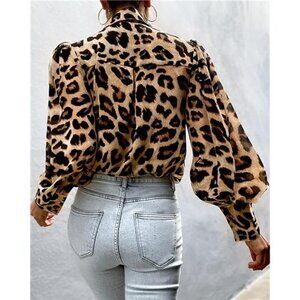 Cheetah Printed Button Up Shirt Casual Long Puff Sleeve Blouse Boho Dressy Top