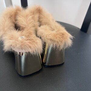 The Shishang NVXIE Cheetah and Fur Shoe in size 43 (US Women's 10.5) is a stylish and unique pair of heels. Made with a cheetah fur upper material, fur lining, and featuring a gold block heel, this pump is both fashionable and comfortable. Perfect for adding a touch of glamour and personality to any outfit, these shoes are sure to make a statement.