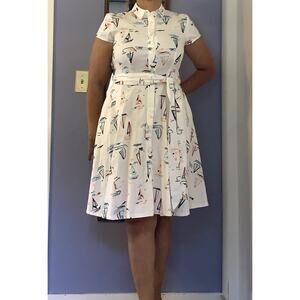 The Cheetah b sail boat pin up A line white dress in size 6 is a stylish and versatile piece perfect for various occasions such as travel, weddings, parties, casual wear, and work. With a V-neckline and knee-length A-line silhouette, this dress exudes a beachy Hawaiian vibe, making it ideal for warm weather in the summer, fall, or spring. The dress features a white color with a touch of cheetah print, adding a trendy and playful element to the nautical and tropical themes. Made from lined fabric, this dress offers comfort and quality for a chic outdoor look.