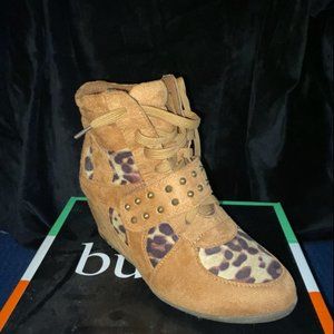 A cute and comfy pair of wedge botties with leopard print and a studded strap across the front. I wore these once and they are very clean. No scuffs or blemishes.