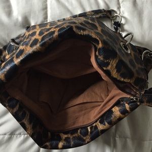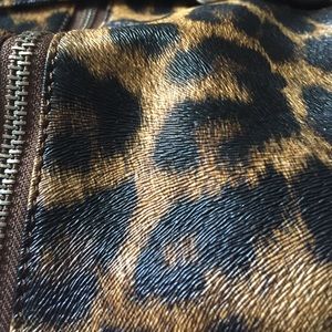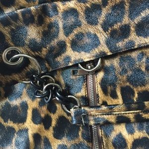 Fun cheetah print purse in an awesome texture. Zippers and fun details make this purse perfect for a party for the party animal. Chain details with the handles