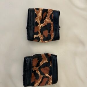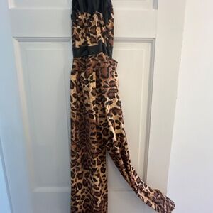 Cheetah print romper with black leather stripe and neck cuff Black leather crisscross straps on the back