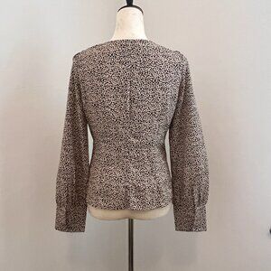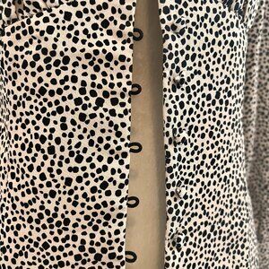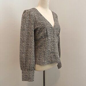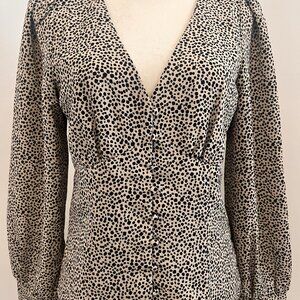 This sleek, woven top, decked out in a trendy black cheetah print, has a sultry V-neckline, a full covered button placket, and long sleeves (with buttoning cuffs) that sprout from slightly gathered shoulders.